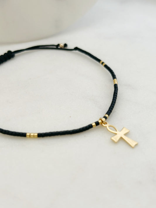 Pulsera Hilo Ajustable de Mostacillas Miyuki + Cruz Egipcia bañada en oro 18k